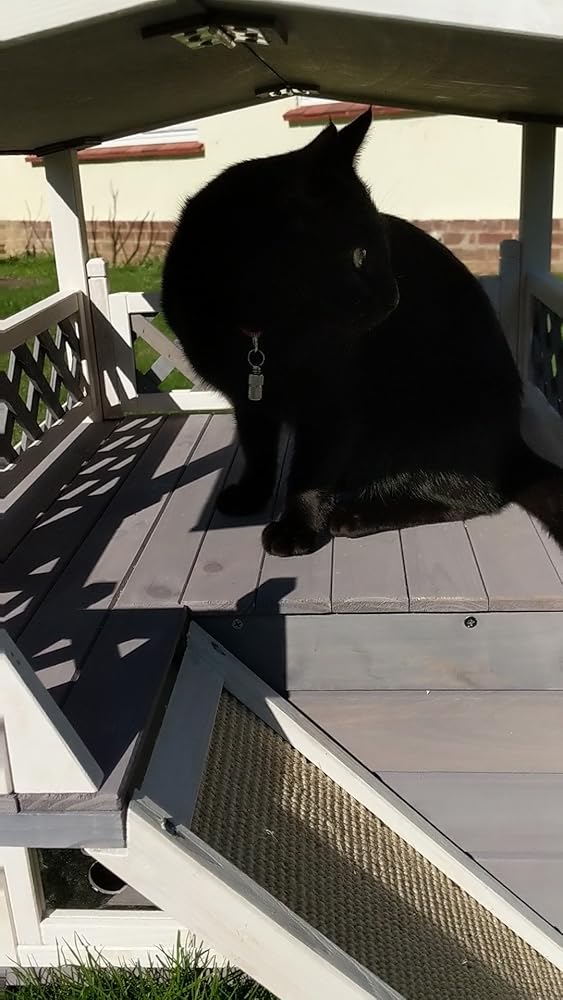 It looks great; one of our guys is lounging up top, under the roof as I type this. Our first outdoor house...well, the roof collapsed after nearly three years. But that wasn't *just* the weather. The neighbourhood kitties, and our one guy, use it as a launch and landing pad when leaving the garden over the seven foot back wall. Plus, he also used the posts as scratchers. We're hoping the sisal ramp will deter that, as the first house had stairs instead. Our other guy uses the ramp to scratch, so maybe he will catch on. If we catch him marring the lovely new posts, I'm going to tightly wrap/glue gun thick sisal around them.Our two are rescues that are terrified of strangers/people. So it gives them safety, as well as comfort. They immediately run out back and hide if someone comes in the front door. So we're happy to have it for them, especially when it's not nice weather outside.