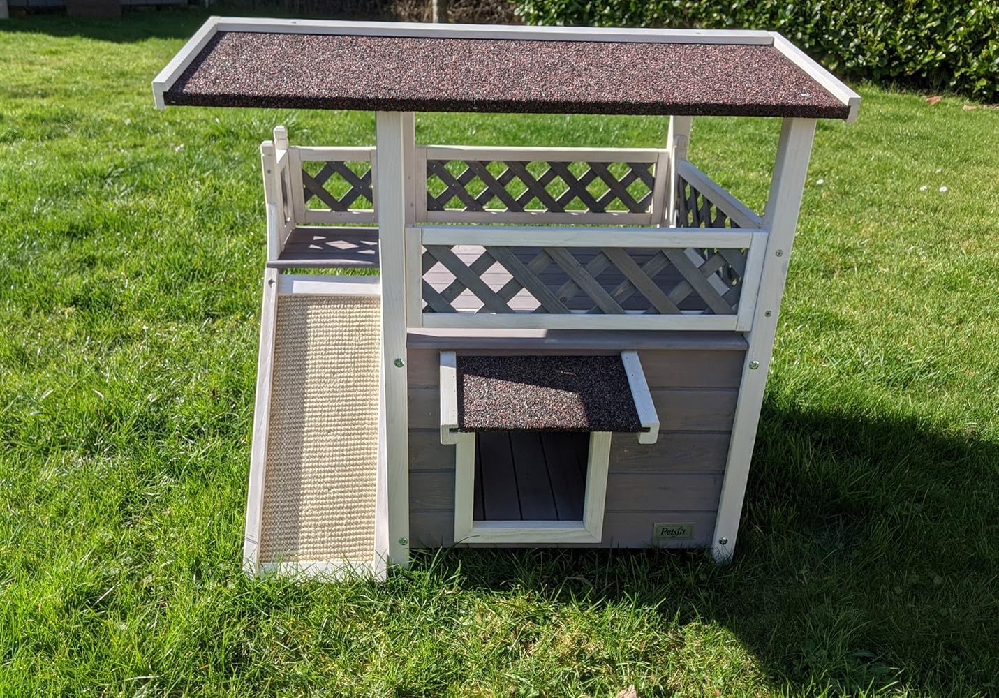 Bought this to replace similar brown lodge that was collapsing due to rain damage over time. This house appears sturdier than the one it replaced and the grey is much more eye catching than the basic brown version. The lower part of this lodge is actually used by my cats as it has two entrances (an improvement on the old house), one entrance with the small canopy which I have left open without the plastic piece and a cat flap which allows light in so cats are far more willing to investigate - they never used this part on the brown version. Think the plastic entrance piece is not a good idea for cats, it is too thick and cats can't see through it. Would recommend this cat house, decent size for adult cats.