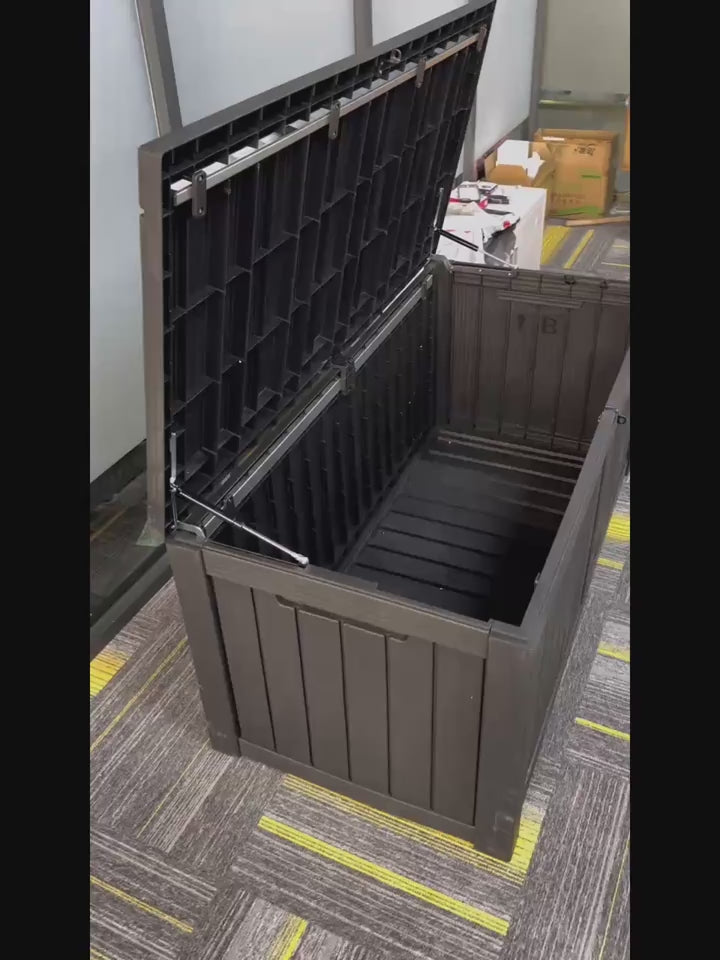 With a sleek black and light brown design, this weatherproof outdoor storage box enhances any environment with a balance of contemporary style and practicality. Its clean lines and neutral tones complement both modern and traditional décor, making it a versatile addition to patios, decks, porches, gardens, and even indoor spaces like mudrooms and garages. It is the perfect combination of attractive aesthetics, thoughtful engineering, and reliable performance.